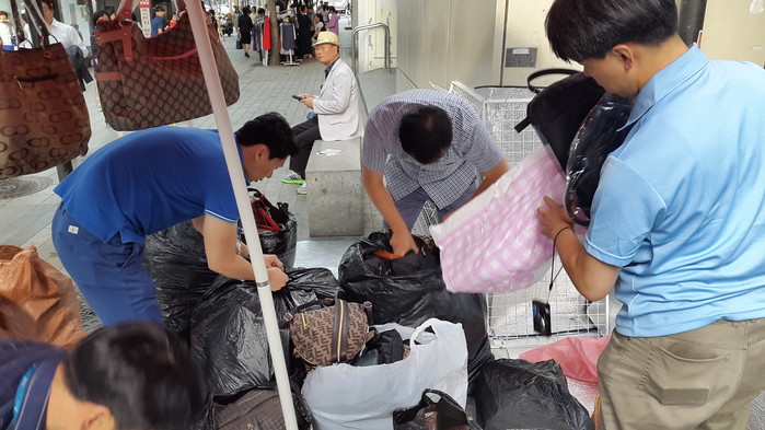 ▲강남구 특별사법경찰관들이 관내 인도에서 판매되는 위조명품을 압수하고 있다. |