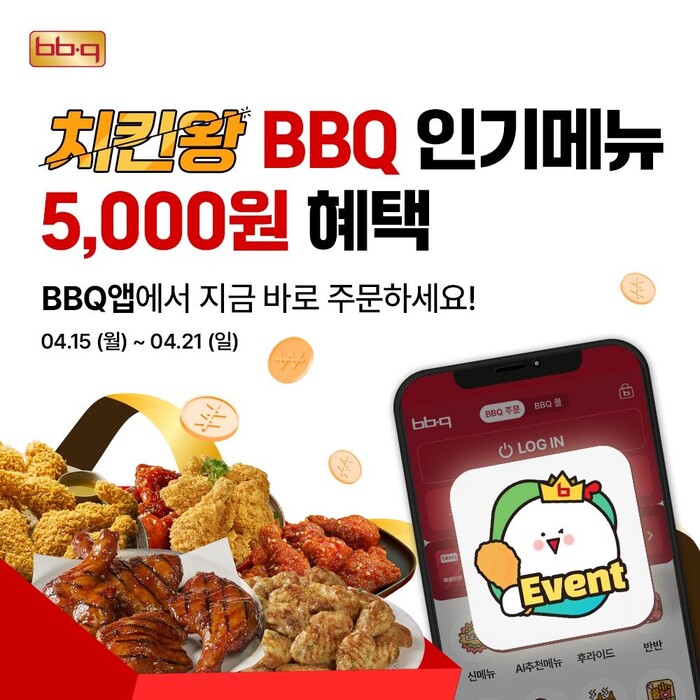 국내 최대 치킨 프랜차이즈 제너시스BBQ 그룹(회장 윤홍근)이 따뜻한 봄을 맞아 오는 21일까지 BBQ앱과 웹사이트에서 인기 메뉴 5종을 자사앱에서 5,000원 할인하는 '치킨왕' 행사를 진행한다고 17일 밝혔다.