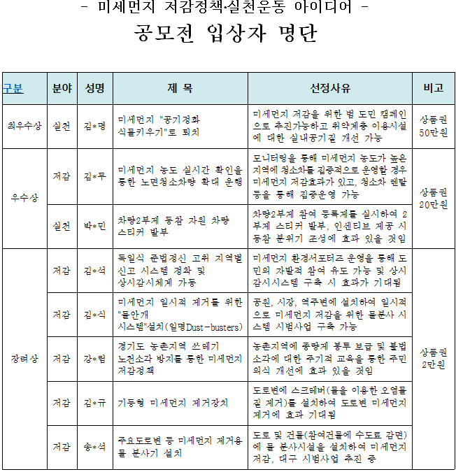도는 ‘미세먼지 저감을 위한 범도민 캠페인’을 통해 일상 생활에서 추진 할 수 있고, 사업 확대 시 다중이용시설에 대한 실내공기질 개선도 가능하다는 점에서 해당 아이디어를 최우수작으로 선정했다.