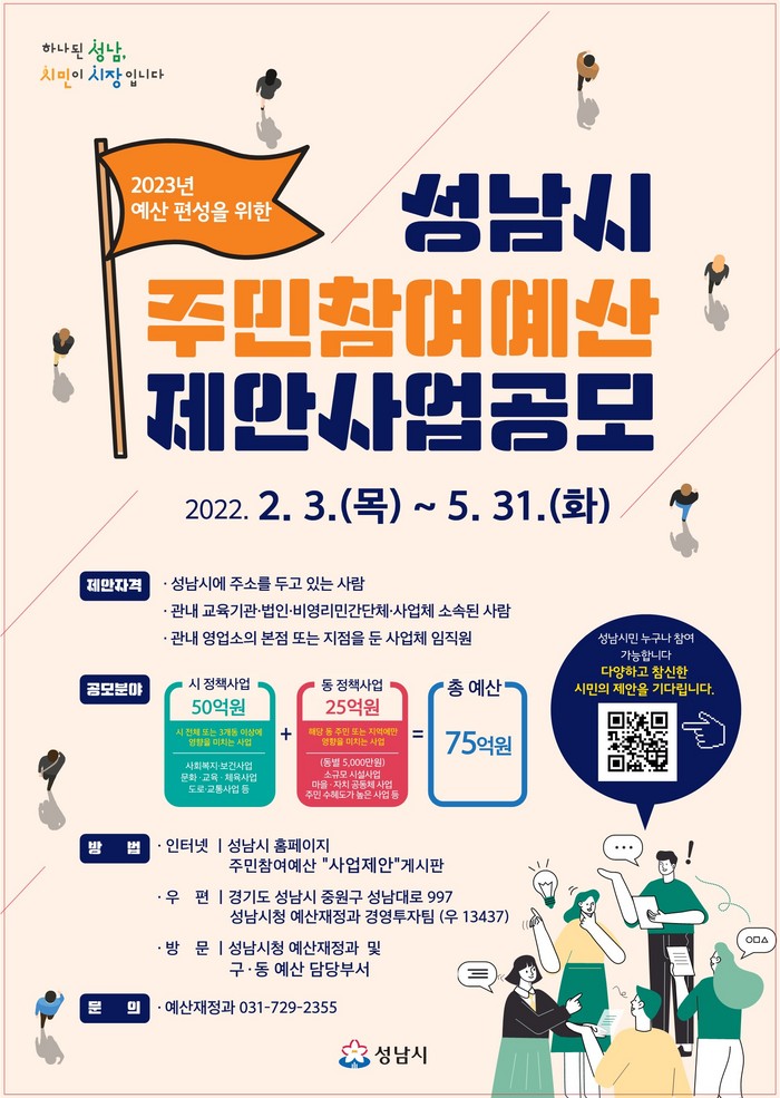 [로컬세계 김병민 기자]경기 성남시는 내년도 예산 편성 반영을 위해 오는 5월 31일까지 ‘주민참여예산 제안사업’을 공모한다.