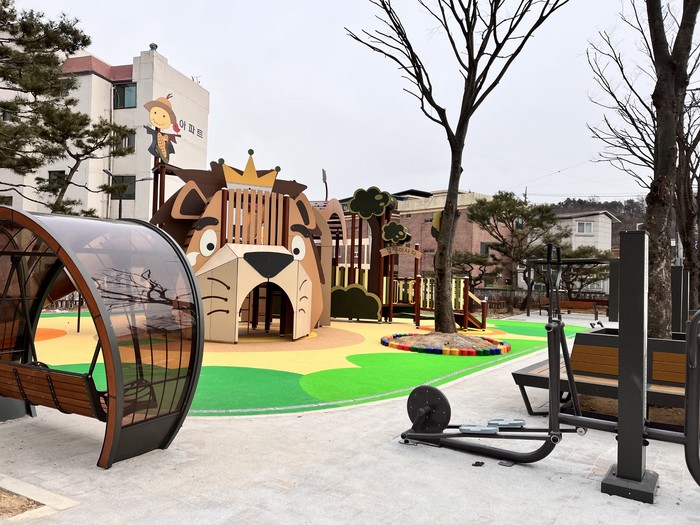 기존 낡은 조합놀이대를 대신해 어린이들이 선호하는 사자 얼굴을 본 딴 조합놀이대를 새로 만들었다.