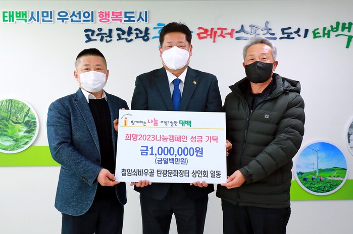 [로컬세계=박상진 기자]강원 태백시 철암 쇠바우골 탄광문화장터 상인회는 지난 2일 태백시청을 방문해 희망2023나눔 캠페인 이웃돕기 성금 100만원을 저소득층을 위해 써달라며 지정기탁했다.