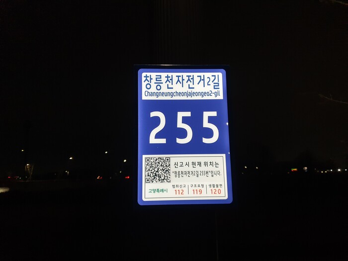 ▲ 창릉천 자전거길 기초번호판(야간). 고양시 제공 |