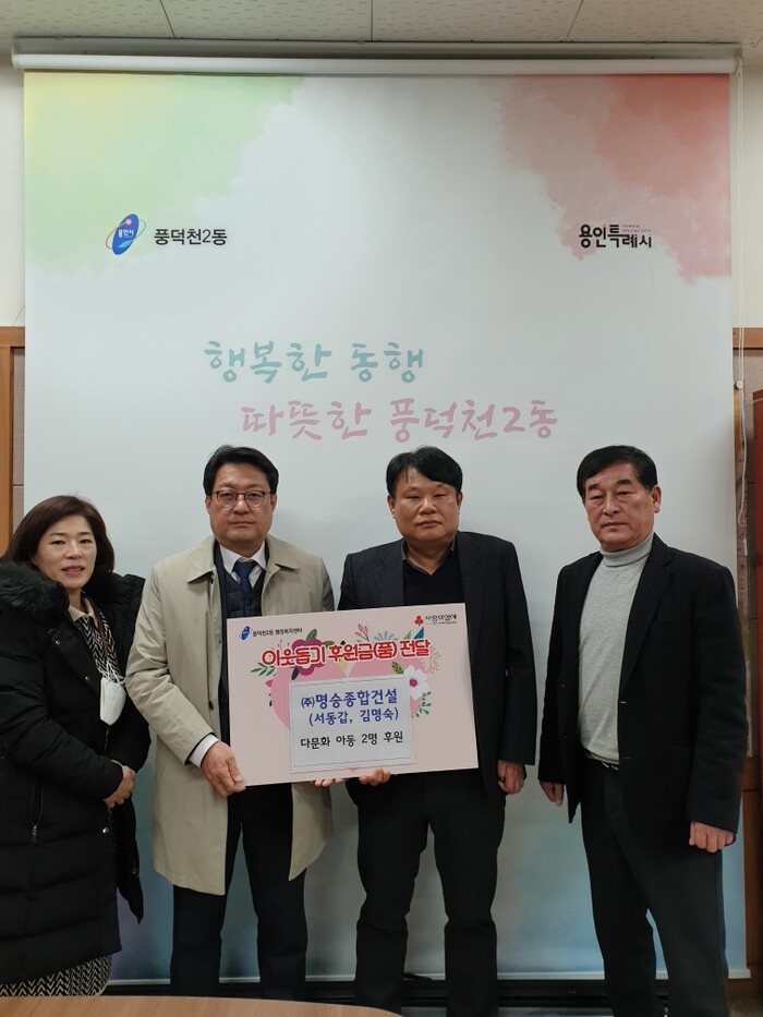 [로컬세계=김병민 기자]경기 용인특례시 수지구 풍덕천2동은 처인구 김량장동 소재 ㈜명승종합건설(대표 김명숙, 서동갑)이 관내 다문화 가정 2가구 아동 2명을 정기 후원키로 했다고 22일 밝혔다.