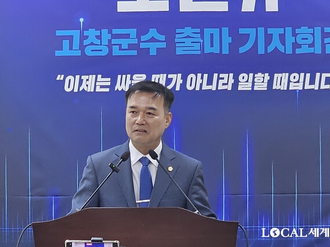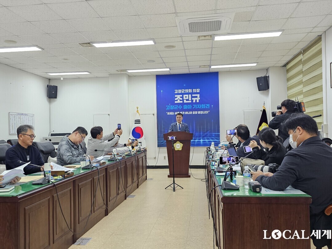 [로컬세계 = 김경락 기자] 고창군의회 조민규 의장(더불어민주당·58)이 21일 오전 고창군의회 회의실에서 기자회견을 열고 민선9기 고창군수 선거 출마를 공식 선언했다.