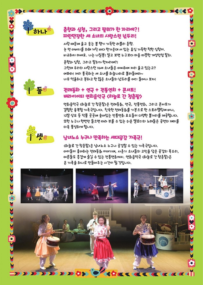 ‘하늘로 간 청춘팥’은 사랑스런 세 소녀가 각자의 사연 때문에 억울해서 울다가 시간과 음악의 신인 하늘님을 만나 서로의 이야기를 주고 받으며 함께 화내고 춤추고 노래 부르면서 치유하고 성장하는 과정을 그린 작품이다.