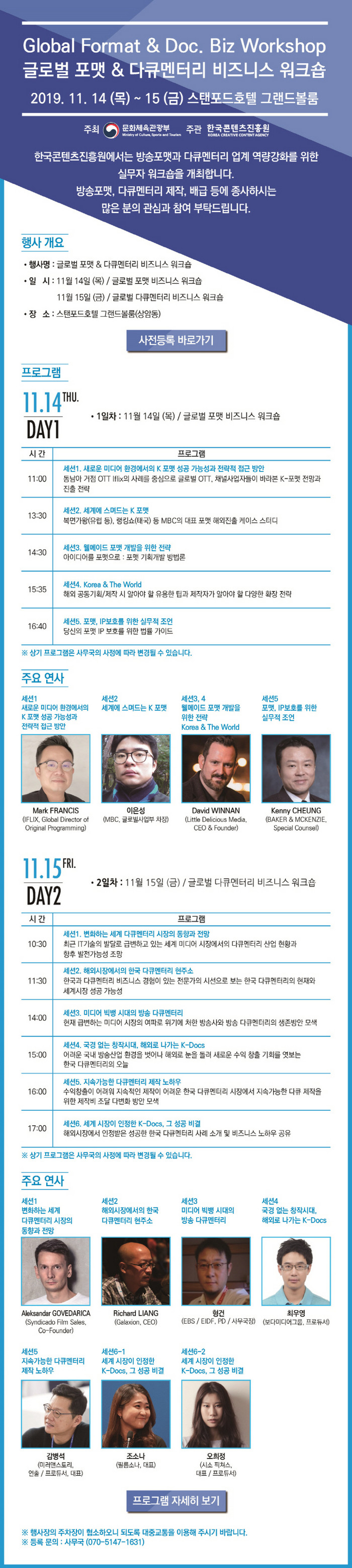 글로벌 포맷 비즈니스 전문가인 ▲영국 ITV의 글로벌 포맷 개발부문 디렉터 등의 경력을 바탕으로 20여 년간 다양한 포맷을 성공시킨 데이비드 위넌(David Winnan) ▲복면가왕의 글로벌 진출을 이끌고 있는 MBC 이은성 글로벌사업부 차장 ▲동남아시아를 평정했다고 평가받는 아이플릭스(Iflix) 오리지널 프로그래밍 디렉터 마크 프랜시스(Mark Francis) ▲글로벌 법률회사인 Baker&Mckenzie 지식재산권(IP) 전문 변호사 케니 청(Kenny Cheung) 등이 주요 연사로 강연에 나설 예정이다.