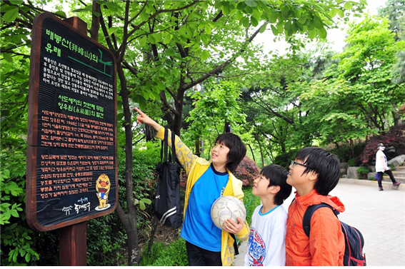 ▲아이들이 배봉산 유래가 적힌 안내판을 보고 있다. |