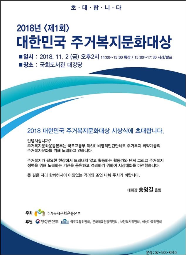 시민단체인 주거복지문화운동본부가 주최하고 행정안전부와 국회 국토교통위원회, 문화체육관광위원회, 보건복지위원회, 여성가족위원회가 후원한다.