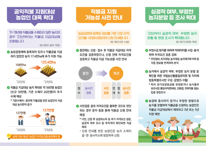 농업농촌공익직불법이 일부 개정돼 2017~2019년에 1회 이상 쌀·밭 직불금을 지급받지 않은 농지도 지급대상농지 요건을 충족하면 신청할 수 있다.