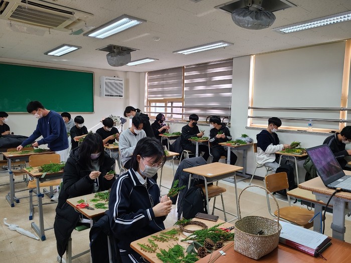 | ▲보라고등학교 고3 학생들이 크리스마스 리스를 만들고 있는 모습. 용인시 제공 |
