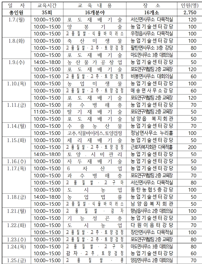 새해농업인실용교육은 변화된 농업정책과 최신 영농기술 공유로 농가 경쟁력을 강화하고자 마련됐으며 읍·면·동, 복지회관, 농협 회의실, 농업기술센터 등에서 실시된다.
