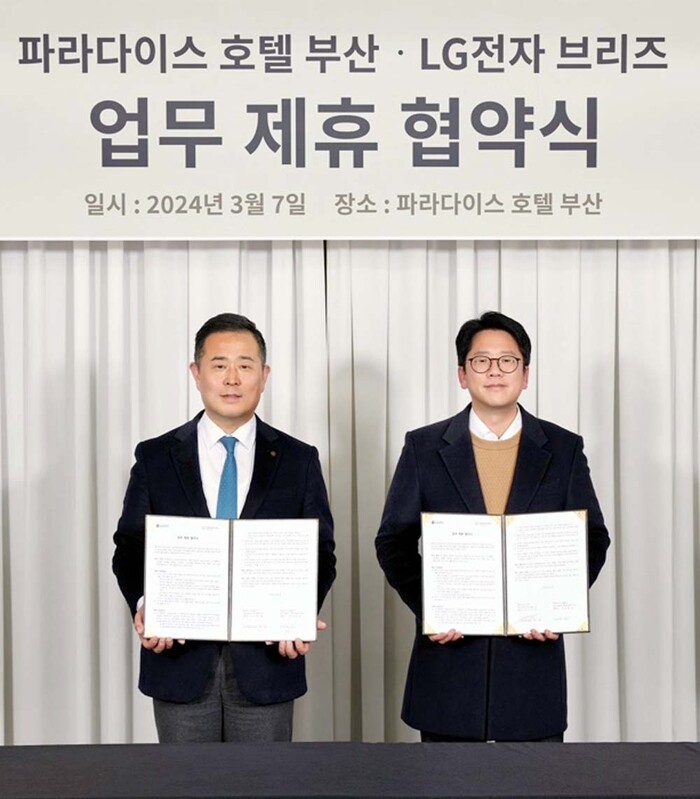 파라다이스 호텔 부산이 지난 7일 웰니스 콘텐츠 강화를 위해 LG전자의 마인드 웰니스 솔루션 ‘브리즈(brid.zzz)’와 업무협약을 체결했다