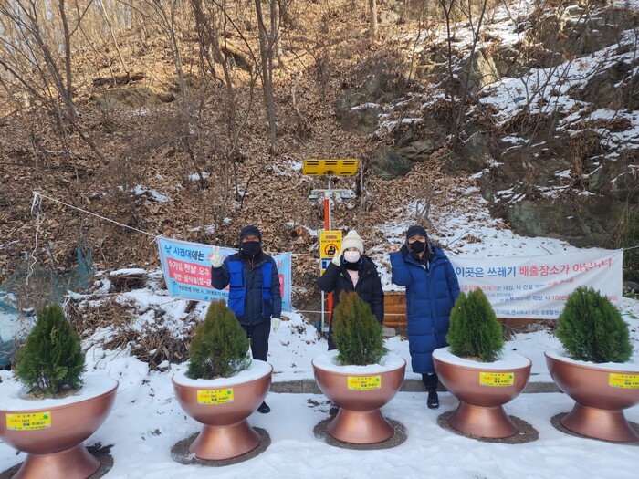 또 쓰레기 무단투기 근절 및 마을 환경정비를 위해 무단투기가 상습적으로 일어나는 지역 두 곳에 양심화분 10개를 설치했다.