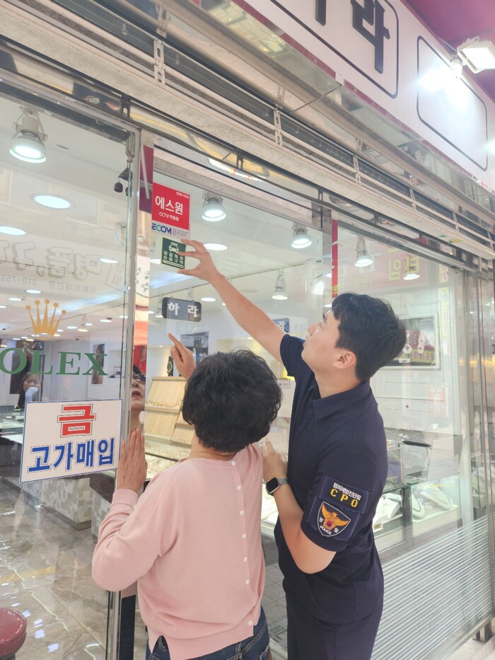 ▲부산진경찰서는 최근 금은방 야간침입절도가 잇따라 발생함에 경찰특별순찰구역 CCTV녹화중 야광스티커를 유리문에 부착하는 사업으로 범죄예방진단팀이 기획했다. 부산진경찰서 제공 |
