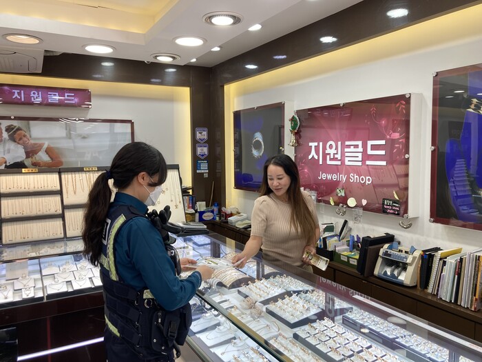 또한 상인들 대상으로 최근 절도수법, 방범시설물 자가점검, 귀금속보관법 등 강·절도 예방 및 대처법이 안내되어있는 전단지를 제작 및 배부하여 범죄예방활동도 함께 전개하였다.
