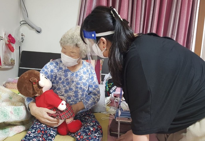 | ▲처인구보건소 치매안심센터가 한 어르신에게 AI돌봄로봇인 '효돌이'를 전달하고 사용법을 안내하고 있다. 용인시 제공 |