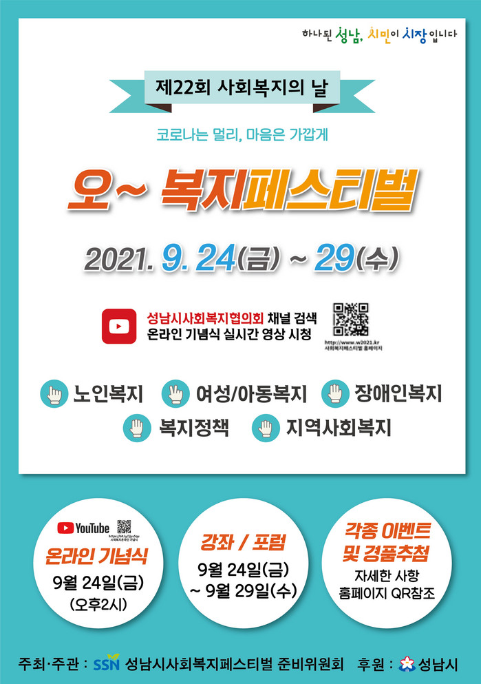 ‘코로나는 멀리, 마음은 가깝게, 오~복지 페스티벌’을 슬로건으로 하는 이번 행사는 성남시사회복지페스티벌 준비위원회가 주최·주관하고 성남시가 후원한다.