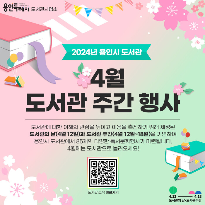 [로컬세계=김병민 기자]경기 용인특례시는 올해 ‘도서관의 날·도서관 주간(내달 12일~18일)’을 맞아 공공도서관 19곳에서 다양한 행사를 연다고 25일 밝혔다.