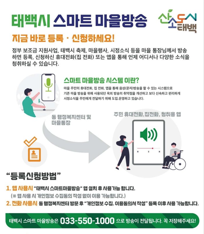 스마트 마을방송시스템 사용을 희망하는 주민은 핸드폰 어플리케이션(태백시 스마트 마을방송 주민용)을 설치하거나 관할 동 행정복지센터 방문 후 개인정보 수집·이용 동의서 작성 등록 후 사용 가능하다.