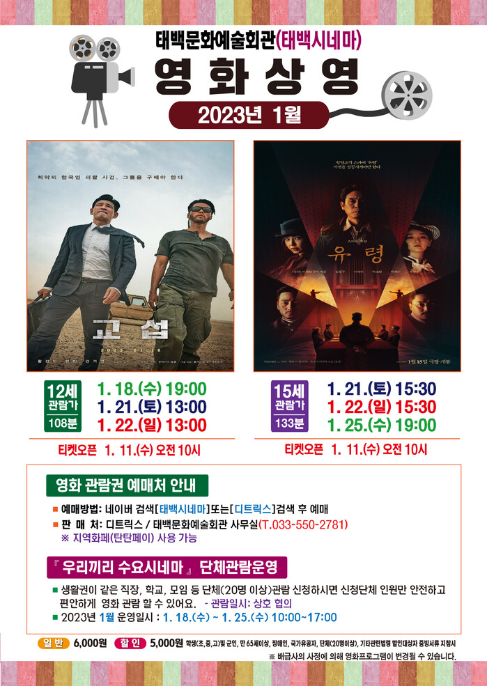 티켓 예매는 오는 11일 오전 10시부터 네이버 ‘태백 시네마’ 또는 ‘디트릭스’ 검색 후 온라인 예매가 가능하며, 온라인 예매가 어려울 경우 태백문화예술회관 사무실에서도 현장 구매가 가능하다.