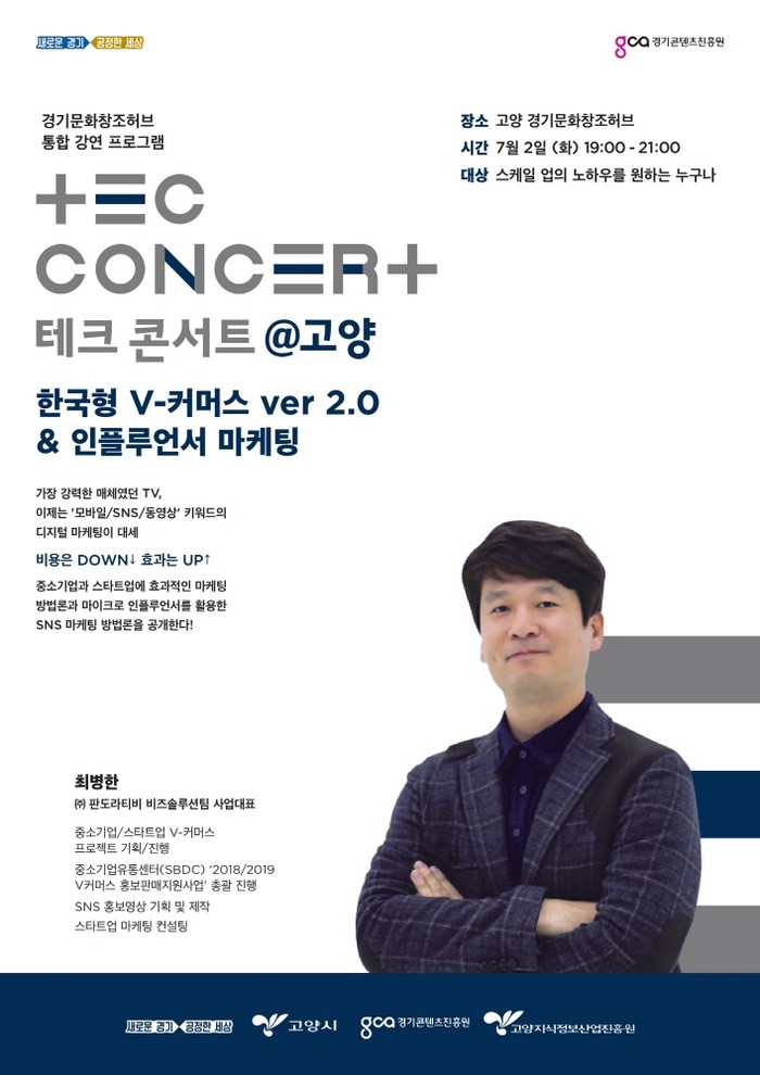 고양허브에서 내달 2일 진행하는 올해 첫 강연은 판도라tv 최병한 대표가 맡는다. 최 대표는 동영상을 활용한 전자상거래(V커머스) 전문가로 ‘한국형 V-커머스 Ver 2.0과 인플루언서 마케팅’을 주제로 중소기업과 스타트업이 효과적으로 활용할 수 있는 SNS 마케팅 방법론을 전한다.