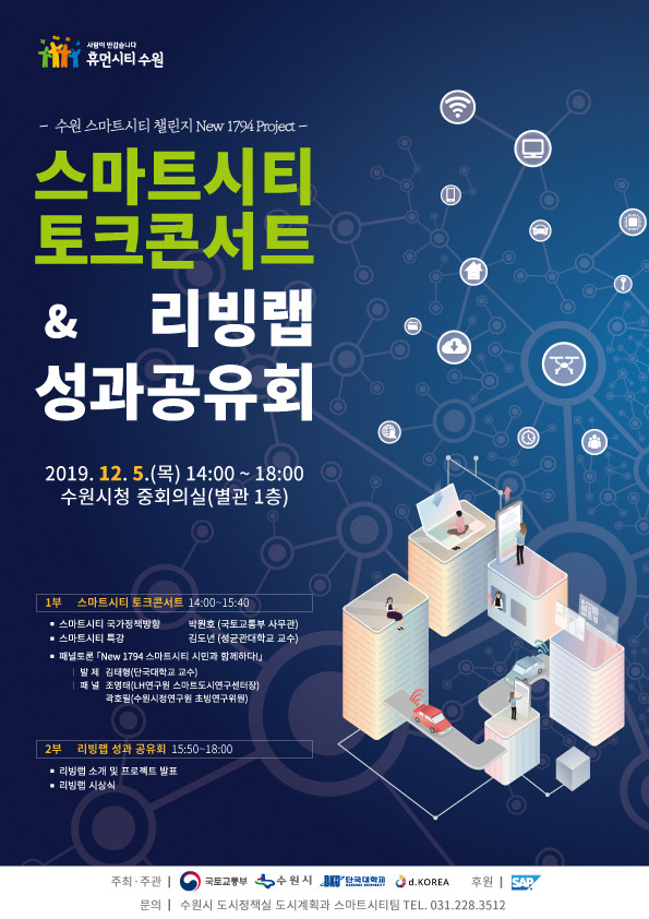 ‘스마트시티 토크 콘서트·리빙랩(Living Lab) 성과 공유회’는 수원시·국토교통부가 주최하는 1부 스마트시티 토크 콘서트와 단국대·(재)디코리아가 주최하는 2부 스마트시티 챌린지 사업 리빙랩 프로젝트(시민 참여 연구소) 성과공유회로 진행된다. 성과공유회는 SAP코리아가 후원한다.
