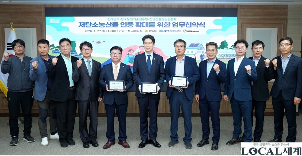 [로컬세계 = 김명진 기자]전라남도는 27일 도청에서 한국농업기술진흥원, 전남친환경농업협회와 함께 저탄소 농산물 인증 확대와 탄소 저감 실천을 위한 업무협약을 했다.