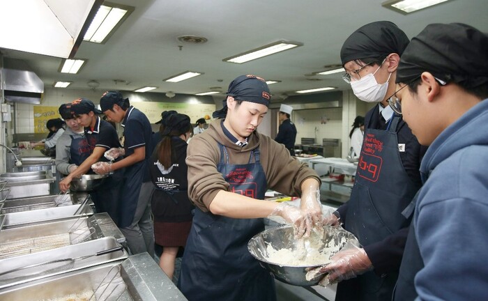 ▲ 직업체험을 위해 BBQ 치킨대학의 '치킨캠프'를 참여한 경기도 소재의 고등학교 학생들이 BBQ 황금올리브 치킨 만드는 방법을 배우고 있다. BBQ 제공 |