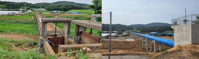 ▲ 논산 노성간선 수로교 시공전.후 모습. 충남도 제공 |