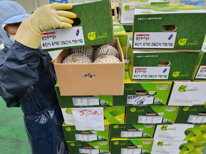 ▲ 용인특례시가 유치원에 다니는 어린이에게 제철 과일을 간식으로 제공한다. 관계자가 제공할 과일을 옮기고 있다. 용인시 제공 |