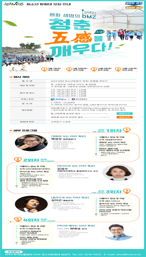 이어 3회차는 김이곤 예술감독이 ‘음악으로 보는 DMZ-음악에 써내려간 분단과 이별의 아픔’을, 4회차는 ‘큰별쌤’으로 유명한 최태성 강사가 ‘역사로 배우는 DMZ-전쟁과 평화’에 대해서 특강을 실시한다.