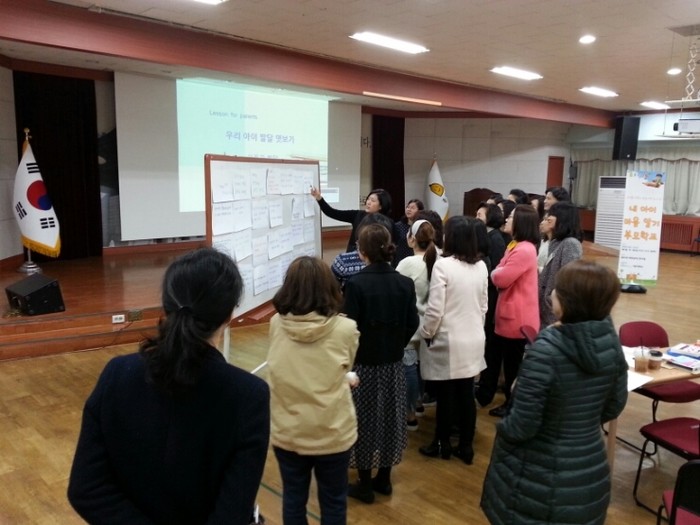 ▲예비학부모들이 아동교육전문가로부터 양육태도 점검하기 등 효율적인 부모역할 수행법 등에 대한 강의를 듣고 있다. |