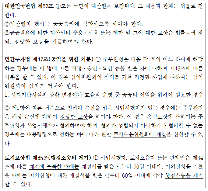 민간투자법 제47조는 사회기반시설의 효율적 운영 등 공공의 이익을 위하여 필요한 경우 사업시행자 지정을 취소할 수 있고 손실에 대하여는 토지수용위원회가 정당한 보상금액을 정하도록 규정하고 있다.