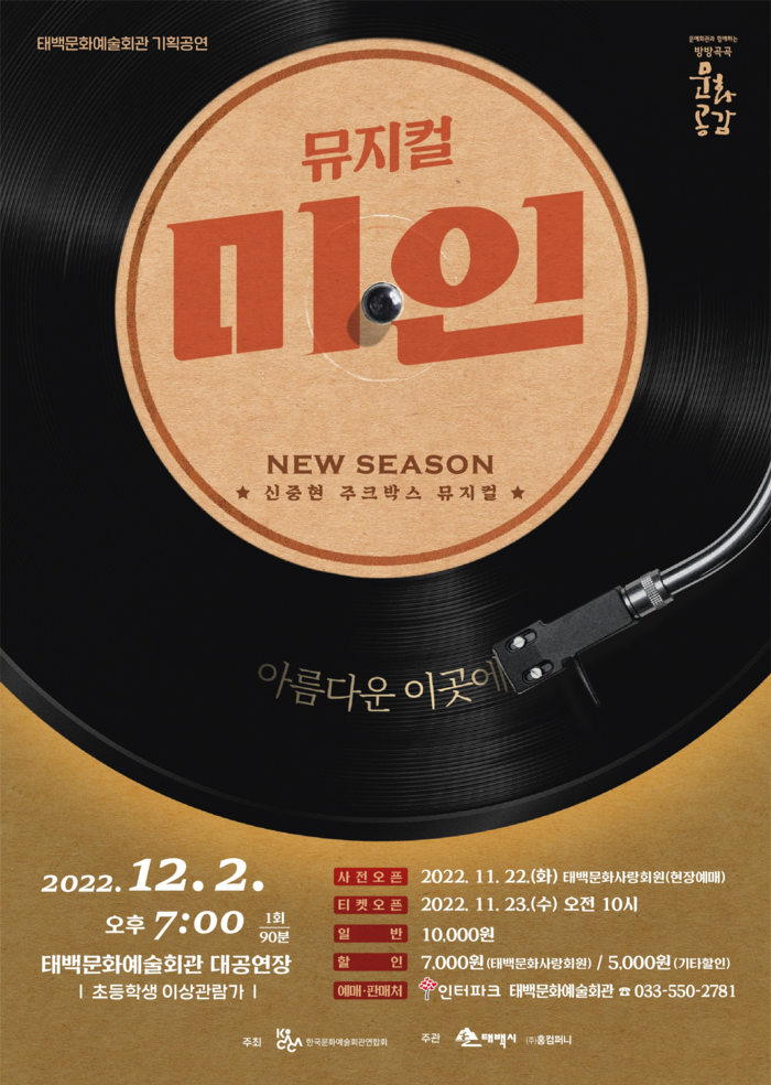 관람 대상은 초등학생 이상 관람 가능하며 티켓 예매는 인터파크(접속 후 ‘태백’으로 검색)를 통한 온라인 예매와 태백문화예술회관 사무실에서 예매가 가능하다.