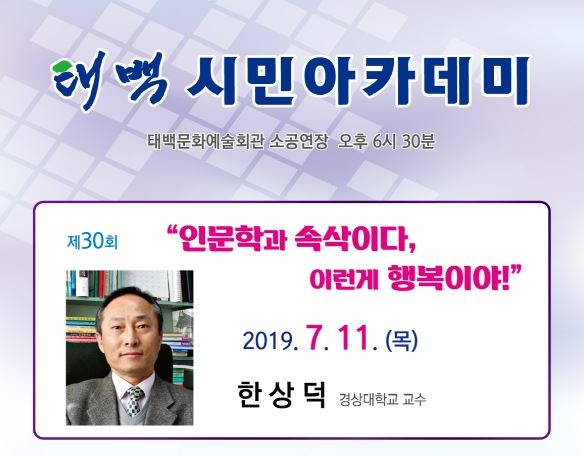 시 관계자는 "한상덕 교수는 공무원연수원 베스트 강사, 경상대학교 제일 잘 가르치는 교수상에 선정되는 등 쉽고 재미있는 강연으로 정평 나 있다"며 "이번 강연을 통해 인문학에 한걸음 더 편안하게 다가가 보시기 바란다"고 말했다.