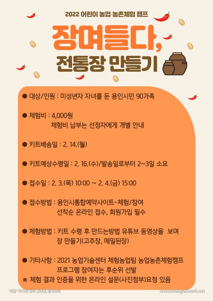 이 프로그램은 코로나19로 인해 어린이들을 위한 체험 프로그램이 대폭 줄어든 상황에서 색다른 경험을 제공하기 위해 마련됐으며, 현장체험 대신 ‘장만들기 키트’를 배송받아 유튜브를 통해 담그기 체험을 공유하는 방식으로 진행된다.