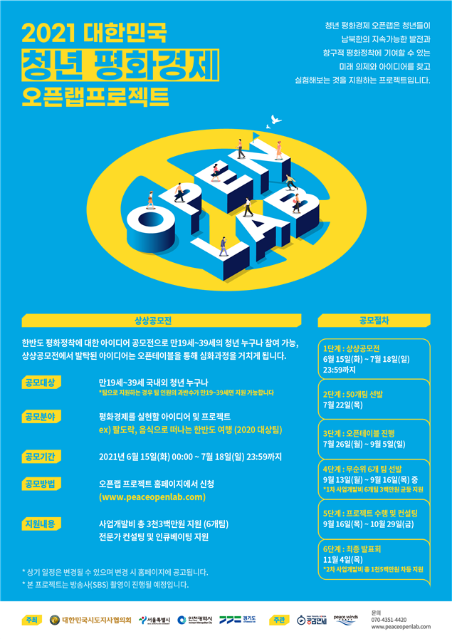 [로컬세계 이혁중 기자]경기도가 올해 대한민국시도지사협의회, 서울시, 인천시와 함께 평화경제에 대한 청년들의 정책 아이디어를 발굴해 사업화까지 지원하는 ‘대한민국 청년 평화경제 오픈랩 프로젝트’를 추진한다고 11일 밝혔다.
