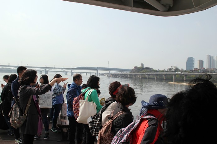 ▲양화진근대사 뱃길 탐방에 참가한 시민들이 한강을 바라보며 해설사의 설명을 듣고 있다. |
