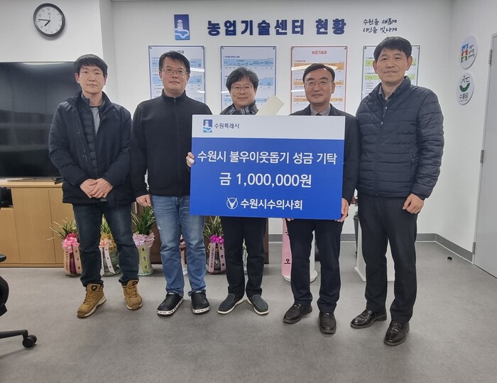 원상철 수원시 수의사회 회장은 지난 5일 저녁 수원시농업기술센터 소장실에서 최종진 농업기술센터 소장에게 성금을 전달했다.