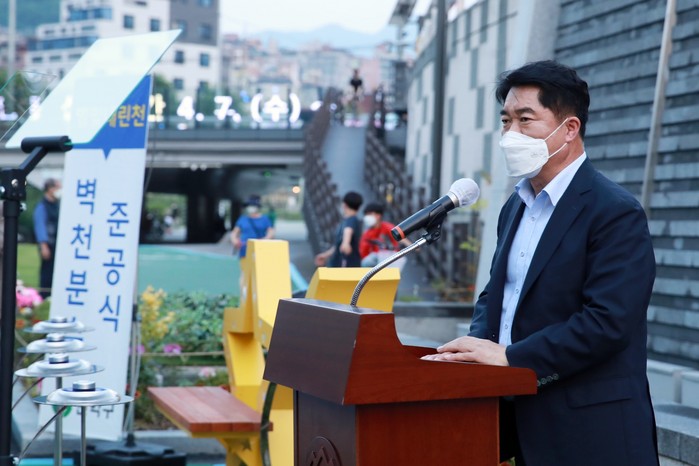 ▲1일 오후, 별빛내린천 벽천분수 조성사업 준공식에서 인사말하는 박준희 관악구청장. |