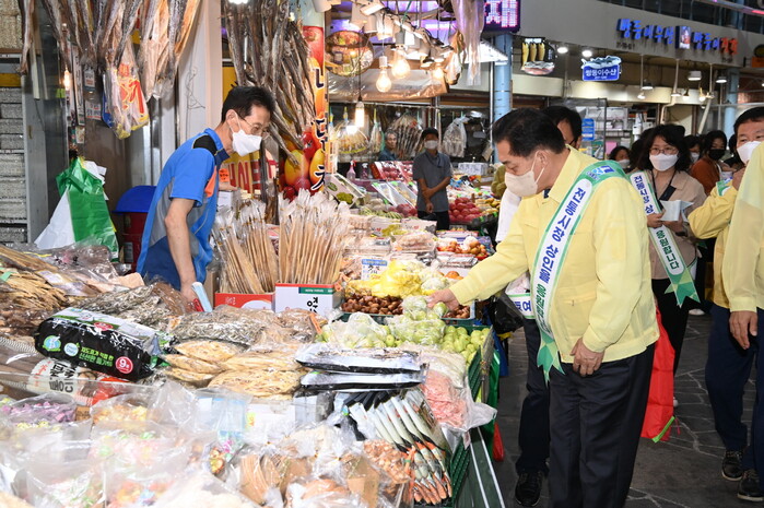 | ▲ 추석 명절을 앞두고 이재준 수원특례시장과 수원시 공직자들이 구매탄시장을 방문해 장을 보며 소상공인들을 격려하고 있다. |