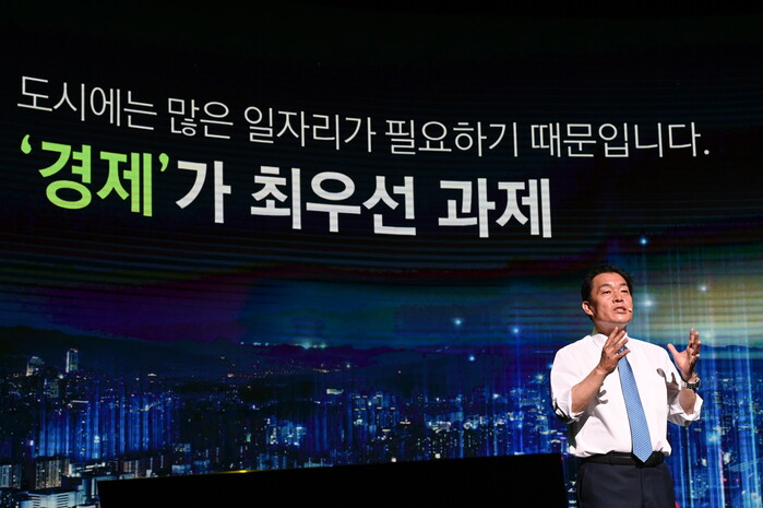 | ▲ 이재준 수원특례시장이 지난 5일 비전선포식에서 탄탄한 경제특례시를 위한 비전을 소개하고 있다. 수원시 제공 |