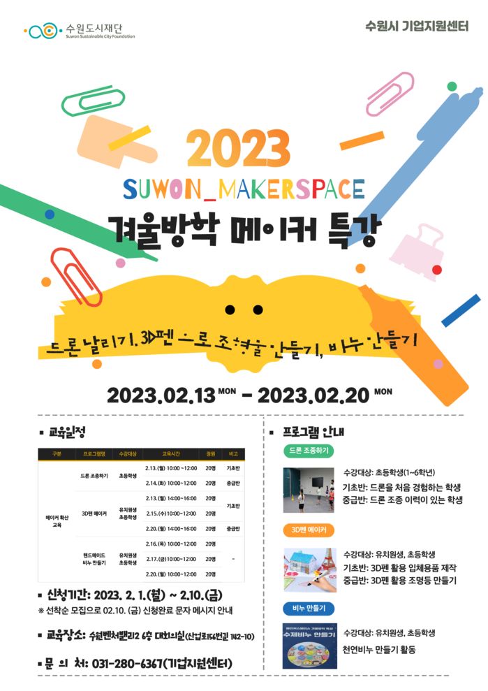 [로컬세계=김병민 기자]경기 수원시가 오는 10일까지 ‘2023 겨울방학 메이커 특강’에 참여할 유치원생, 초등학생을 프로그램별로 20명 선착순 모집한다.