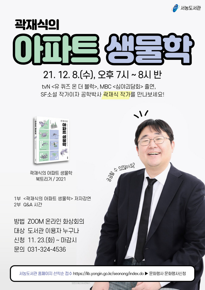 [로컬세계 김병민 기자]경기 용인시 기흥구 서농도서관은 다음달 8일 오후 7시부터 화상회의 앱 줌(ZOOM)을 통해 ‘곽재식의 아파트 생물학’ 저자인 곽재식 작가를 초청, 온라인 특강을 진행한다고 28일 밝혔다.