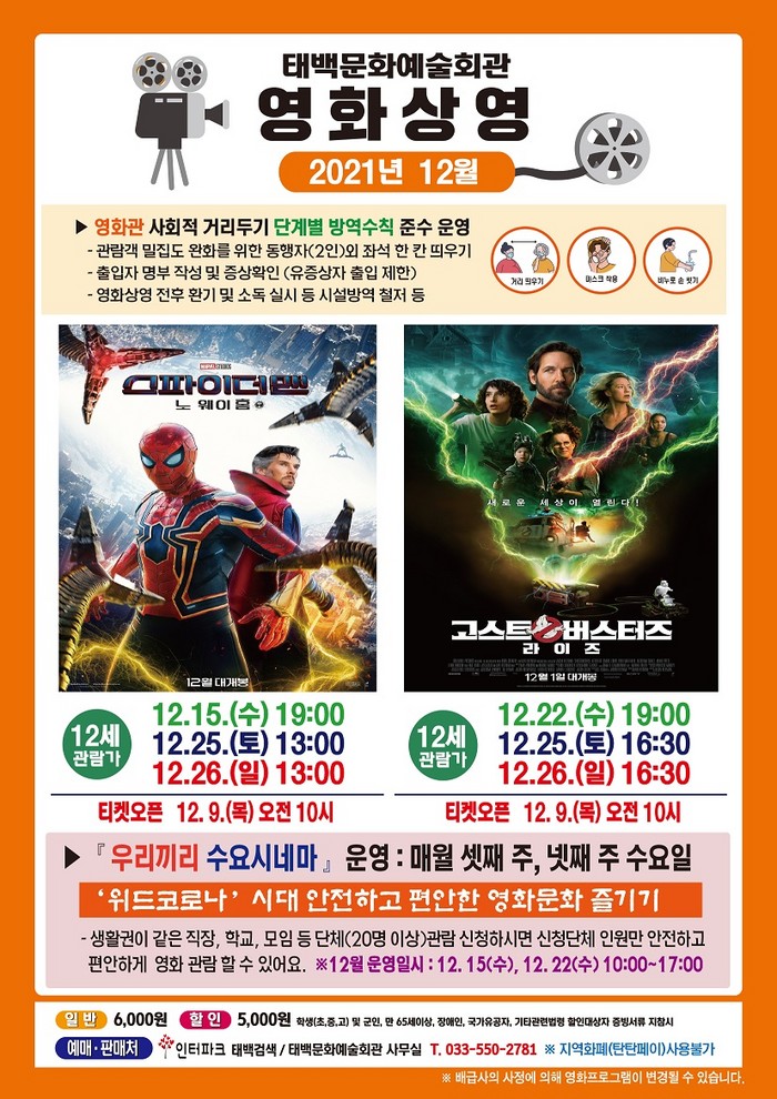 영화상영은 ‘ 스파이더맨(노 웨이홈)’이 오는 15일 수요일 오후 7시, 오는 25일 토요일과 26일 일요일 오후1시에 상영된다.