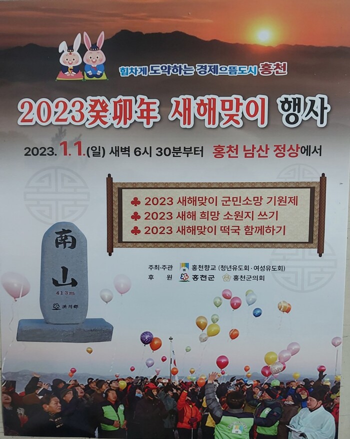 홍천 남산정상에서 개최되는 새해맞이 행사는 군민의 안녕과 화합을 축원하는 기원제, 새해 소망을 염원하는 해맞이와 소원지 쓰기, 남산주차장에서 새해 떡국 함께하기 등이 열린다.