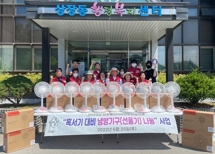 이번 나눔행사는 상장동 특화사업으로 추진하고 있는 ‘행복한 동행, 사랑 꾸러미 나눔사업’의 일환으로, 생활취약 10가구에 선풍기를 설치하고 거주환경과 안부 확인도 병행했다.
