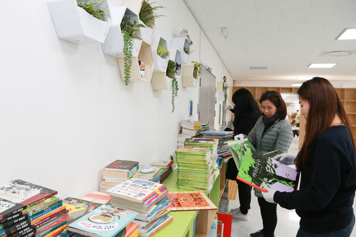 | ▲자원봉사자들이 책놀이터를 꾸미고 있다. |