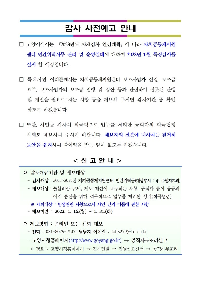 또한 고양시는 1월 18일부터 1월 31일까지‘시민과 함께하는 공개 감사’를 실시, 거짓이나 부정한 방법으로 지방보조금을 교부받거나 직원의 비리, 위법·부당행위 등에 대한 내부직원 및 시민들의 제보를 받고 있다.